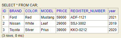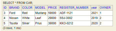 repository.save(new Car("Ford", "Mustang", "Red", "ADF-1121", 2021, 59000, owner1));