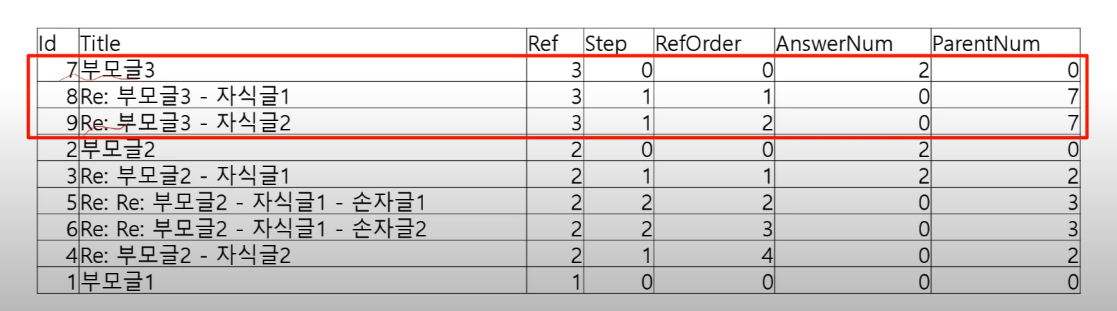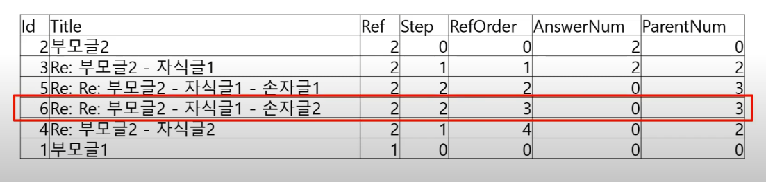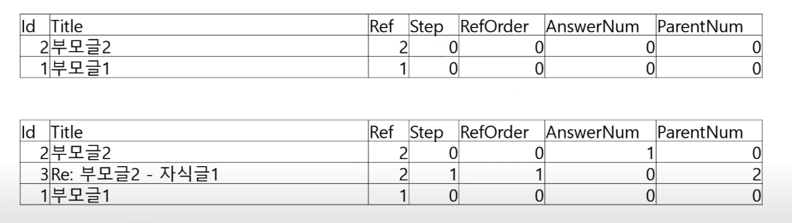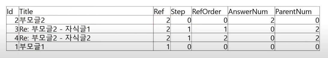 ParentNum : 부모글의 기본키 (부모글의 Ref 말고 부모글의 Id 의미함)