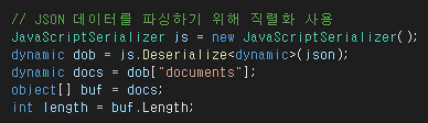 - JavaScriptSerializer 객체를 사용하여 JSON 문자열을 직렬화하여 C#의 dynamic 타입인 dob 변수에 저장