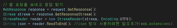 String json = reader.ReadToEnd(); //json 방식 사용하려면 참조추가(web.extensions)