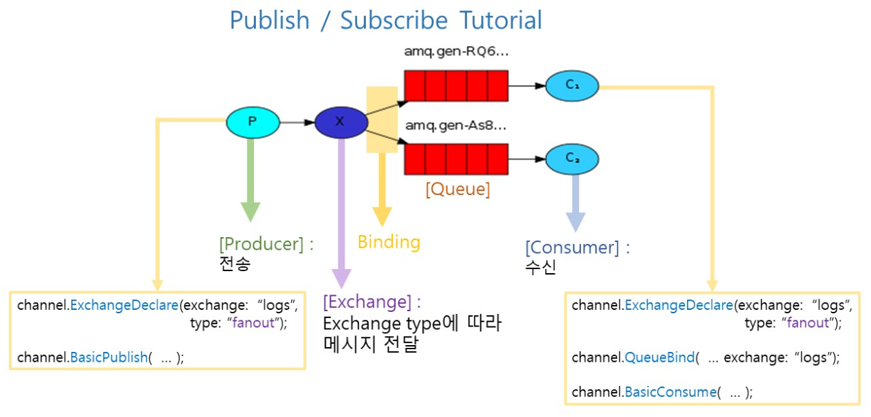 - Publish/Subscribe : 하나의 메시지를 여러 개의 Consumer에게 전달할 때 쓰이는 패턴