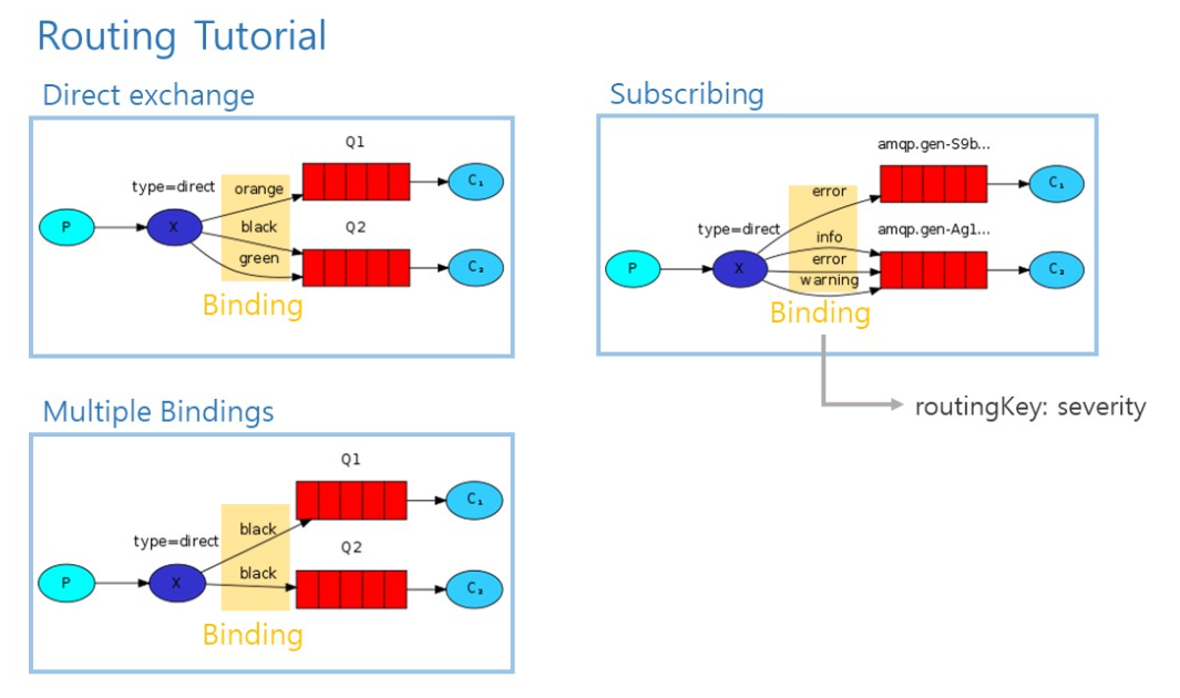 - Routing : Exchange가 Queue에 메세지 전달하는 과정
