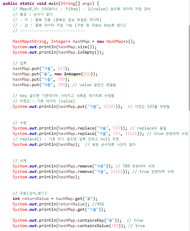 * Map : 순서X, key는 유일한 값, value만 데이터 중복O => 키 똑같은것이 들어오면 수정처리=> put, get, replace, remove